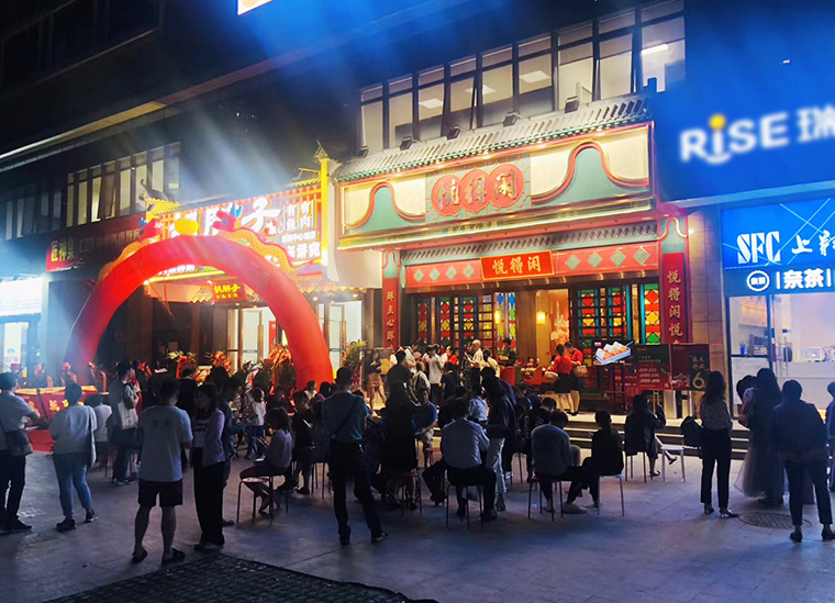 8、門頭形象:門頭是品牌的臉面,也是顧客接觸我們的第一個場景。門頭形象具有廣而告之的作用,門頭代表著餐廳的名字叫什么,賣的產品是什么,這是最基本且不可或缺的要素。門頭完全可以作為全方位展示店特色的工具,巧妙的組合可用信息向客戶發送品牌信息,從而引發客戶興趣。悅得閑廣式點心茶樓的門頭大量使用鑊耳山墻,讓廣式茶樓的特性展露無遺。