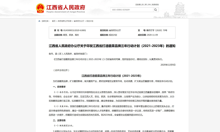 《江西省打造贛菜品牌三年行動計劃(2021~2023年)》(以下簡稱《行動計劃》)共提出包括做優贛菜企業、提升贛菜品牌等主要任務。