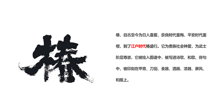 “椿花”是日本對(duì)山茶花的稱呼,花期一般是在冬至春季。椿花的花色秀麗脫俗,香氣清新怡人,人聞到后有精神爽朗的感覺(jué)。在日本,椿花與櫻花齊名,被譽(yù)為“圣花”。奈良時(shí)代重梅、平安時(shí)代重櫻,到了江戶時(shí)代椿盛行。“椿”為貴族社會(huì)鐘愛,為武士階層尊崇,它被繪入圖譜中,被寫進(jìn)詩(shī)歌、和歌、俳句中,被印刻在甲胄、刀劍、食器、酒器、漆器、屏風(fēng)、和服上。