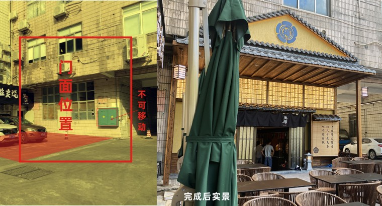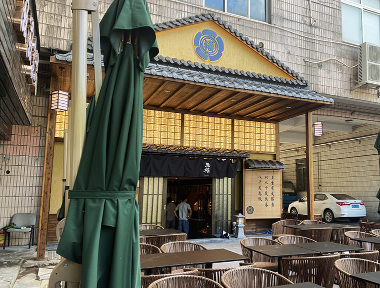 門口的日式推拉門、地?zé)簟⑶嗍濉⒋换?、炭黑色的日式布簾、遮蓋燃?xì)獗硐潴w的竹制卷簾,整個(gè)門頭把