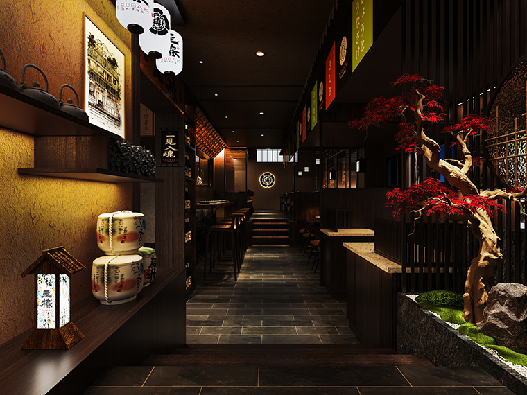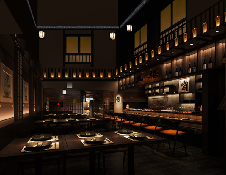 2、一樓大廳及吊頂?shù)脑O(shè)計(jì):把京都的古老街道,巷子搬到我們店里。整個(gè)大廳的頂部環(huán)繞一圈日式黑瓦頂,四周幾個(gè)日式玻璃木窗,與地面的青石瓦面,墻體的稻草漆,燒烤吧臺(tái)形成一體化的京都風(fēng)格。置身其中,仿佛