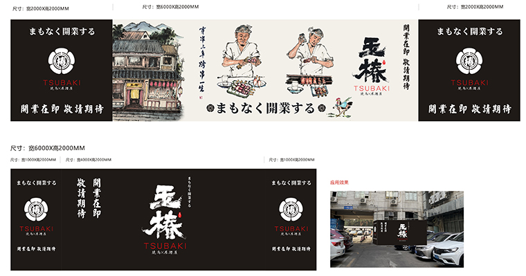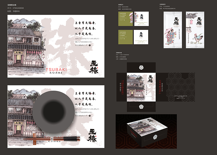 我們希望透過(guò)這個(gè)書法文字的LOGO標(biāo)識(shí)及輔助的家徽?qǐng)D案塑造玉椿經(jīng)典的日式美學(xué)氣質(zhì)和料理文化底蘊(yùn)。表達(dá)品牌傳承百年,初心如一的愿景,使之成為指引玉椿品牌前進(jìn)的燈塔。玉椿燒鳥居酒屋,將“