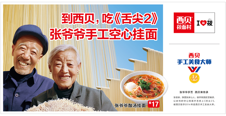 西貝莜面村與“舌尖上的中國”里張爺爺空心掛面的創始人合作,對外宣傳“吃張爺爺空心掛面,感受舌尖上的味道”。