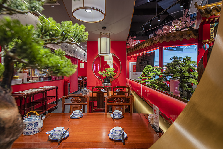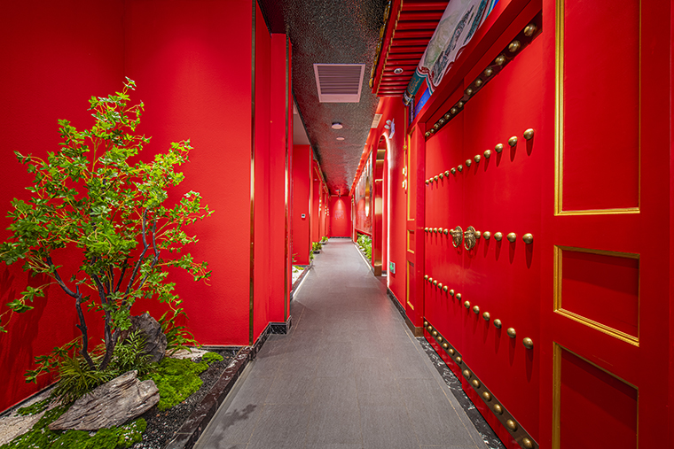 1、本項目為京味張東莞大朗碧桂園里悅里店,總面積約829平方米。用中國紅強化品牌內含的北京皇城文化,令人印象鮮明;