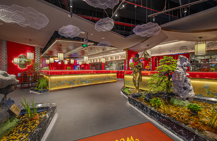 門口的迎賓人,提籠遛鳥人,跑堂人等雕塑銅人將老北京烤鴨飲食文化自然帶出;空間大量借鑒中式園林造景手法,點綴綠植,水景,框景,步移景異;