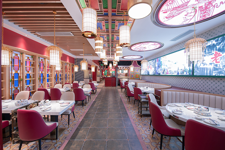 寶粵樓將嶺南園林古建筑的鑊耳山墻,廣式花窗引入整體空間裝飾中,大面積紅色、深綠色、廣式灰磚的搭配使用,將傳統(tǒng)廣州西關(guān)文化以時(shí)尚更精致的形式表現(xiàn),為上海人民帶來了提溜鳥籠嘆早茶的“得閑飲茶”生活方式。