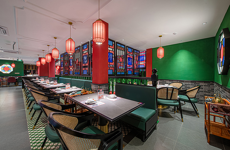 1、用品牌強關聯的具體一個元素串聯整個裝飾,形成品牌專屬識別記憶。空間中我們使用了滿洲窗,用滿洲花窗串聯整個門店,與品牌傳達的西關老號,五代傳承高度貼合,拍照打卡效果很好,老茶樓的氛圍感迅速出來了。